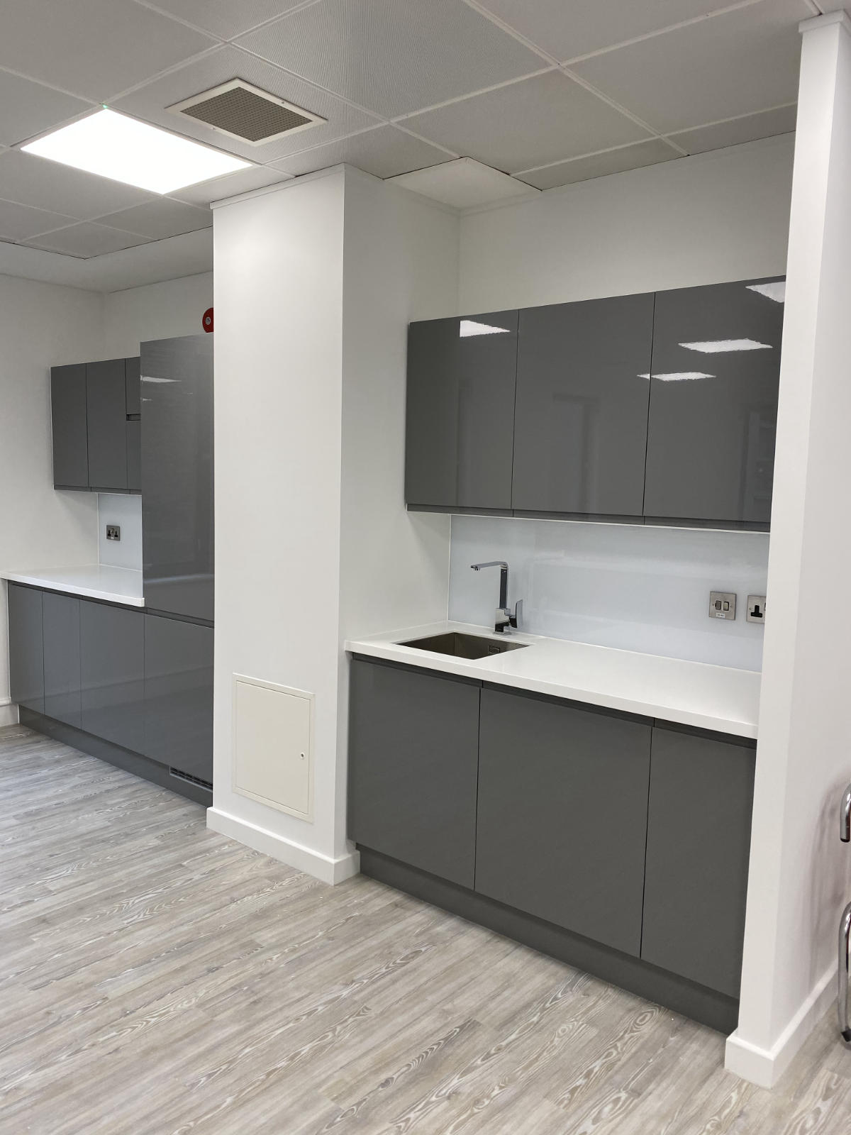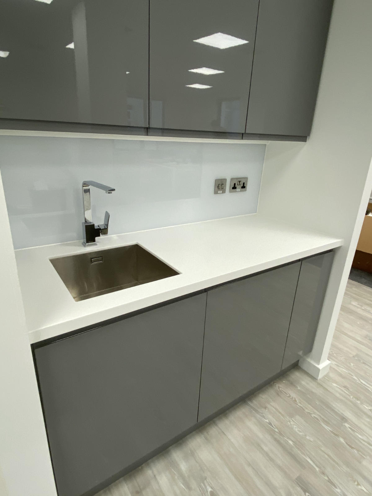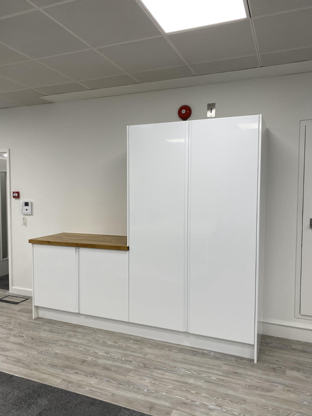 The J handle design incorporated within the gloss white storage cupboards creates a clean and minimalistic feel.