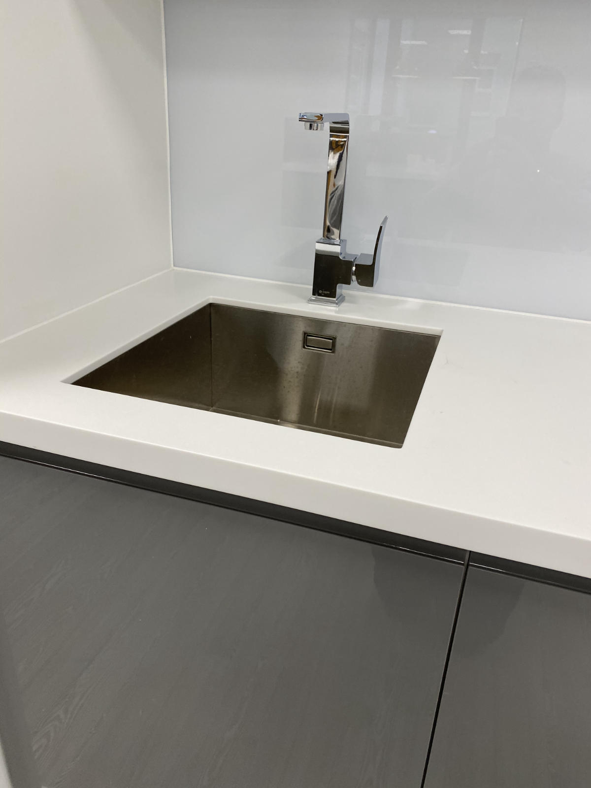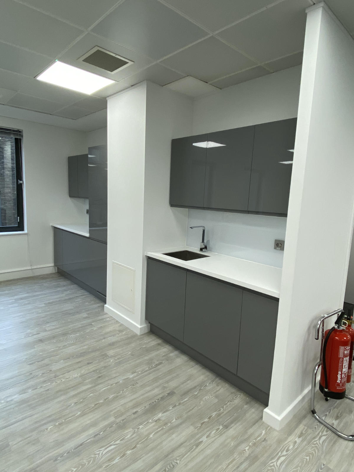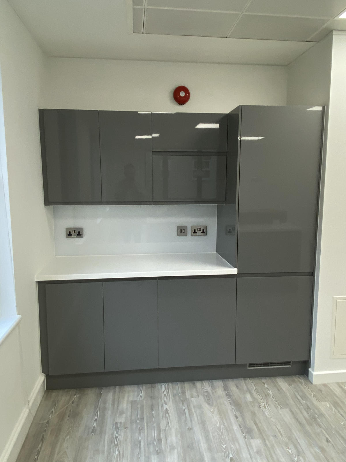 The J handle design incorporated within the gloss white storage cupboards creates a clean and minimalistic feel.