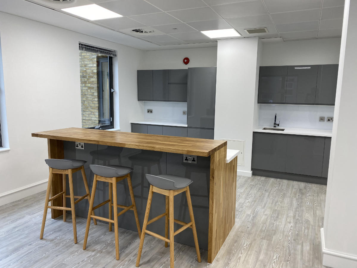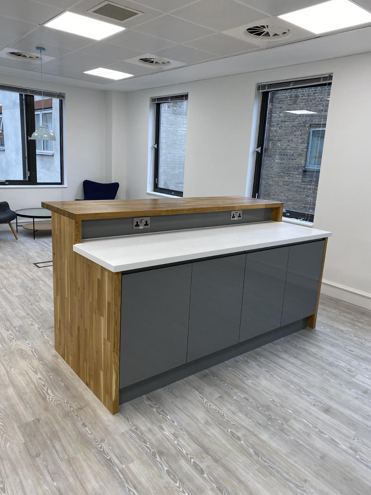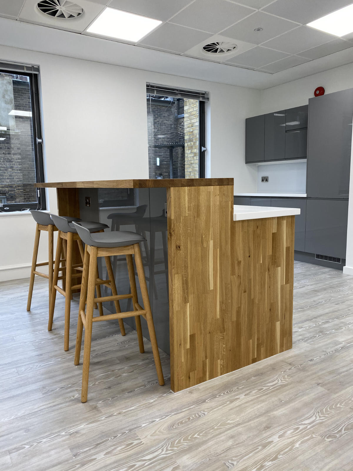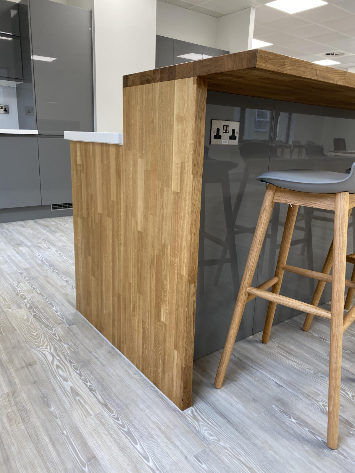Bushcrafted designed and installed this purpose-made island high seating breakfast bar, complete with undermount stainless steel sink that complements the integrated wall and base units. Worksurfaces were built from a light oak solid timber block and Snow White Krion, set off by the gloss grey of the doors.