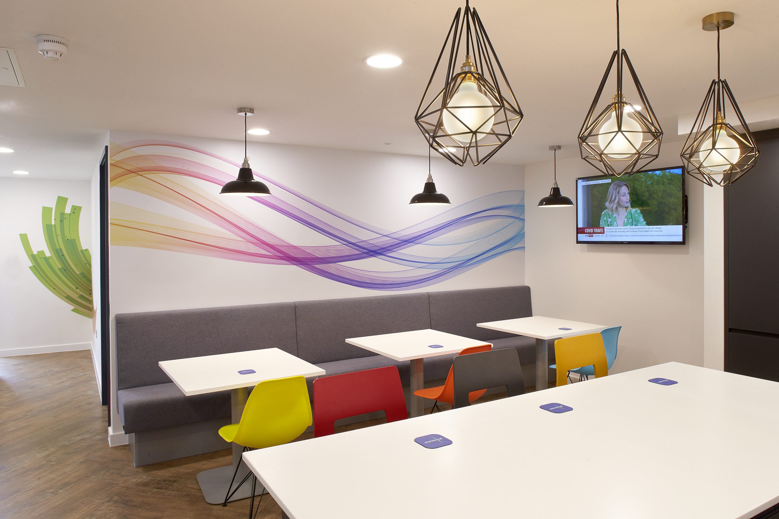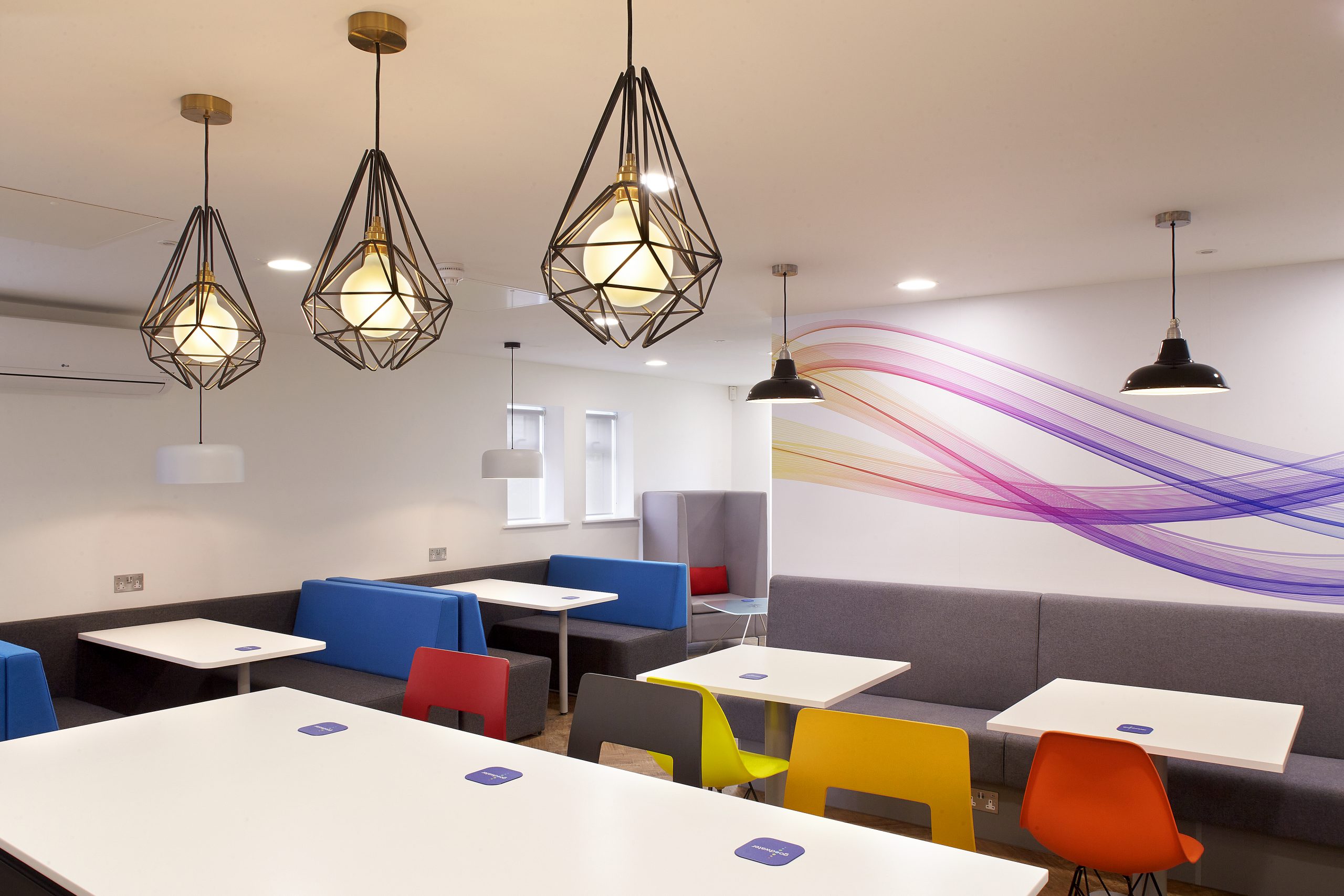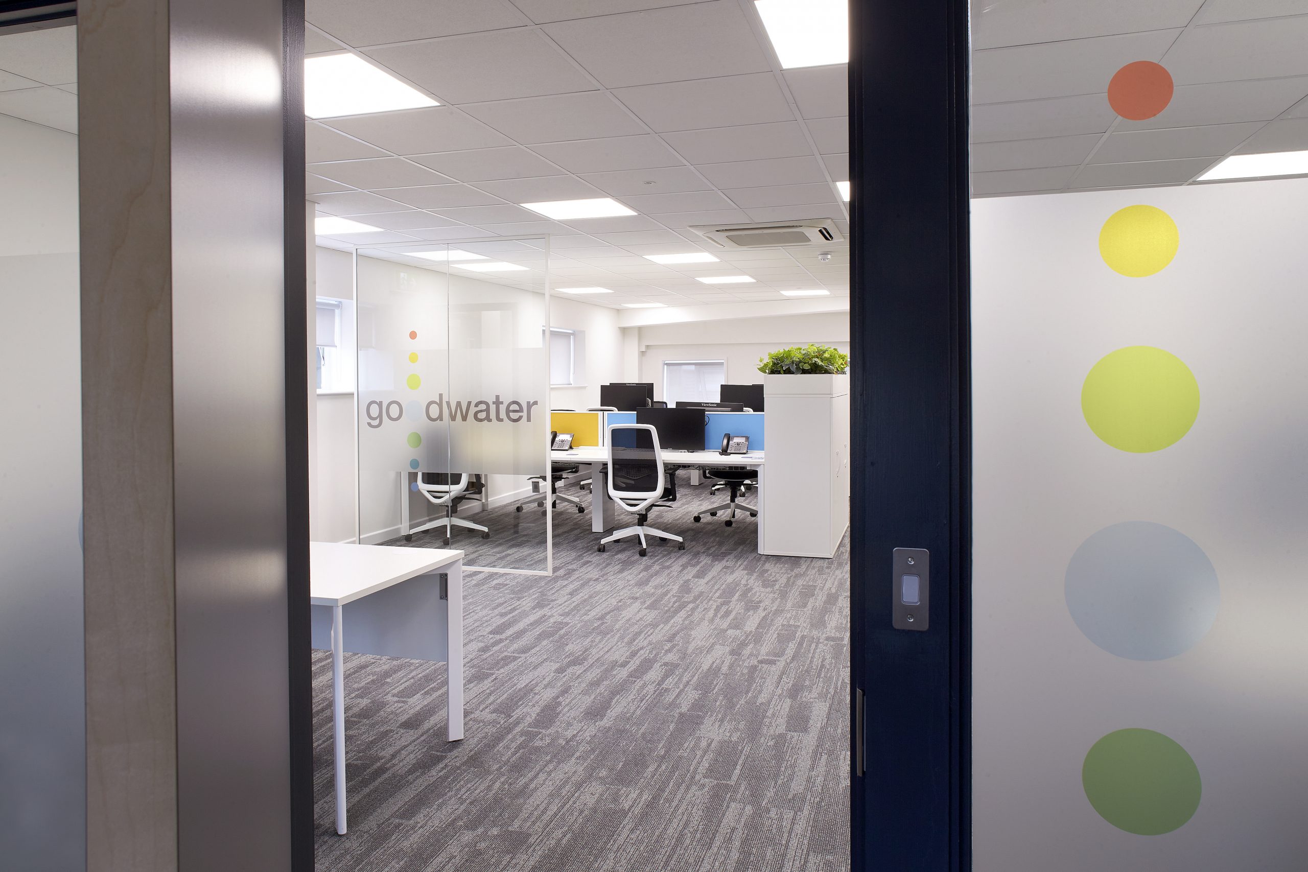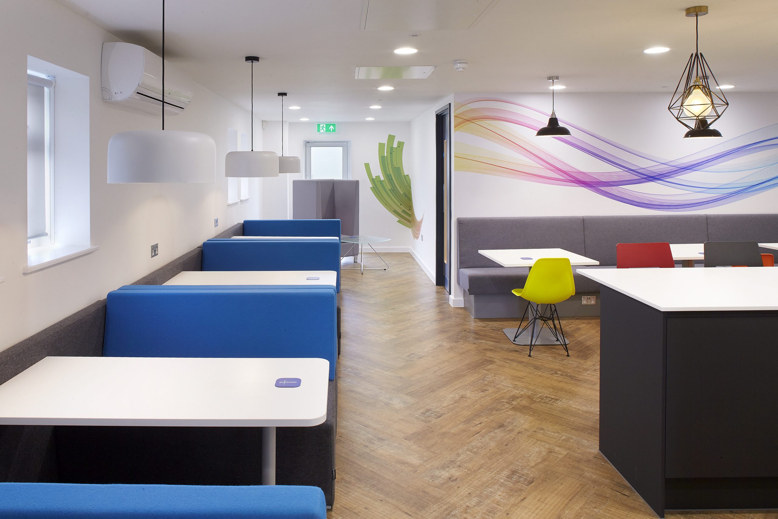 Bushcrafted assisted in the refurbishment of the two floors that make up the Goodwater head office. Featuring the bold, colourful company branding was integral to the design. We made design choices to incorporate the logo throughout the office, giving a warm welcome and inspiring aesthetic for both guests and employees. The bright colour pallet combined with striking graphics feature across both floors for a bright and inviting finish.
