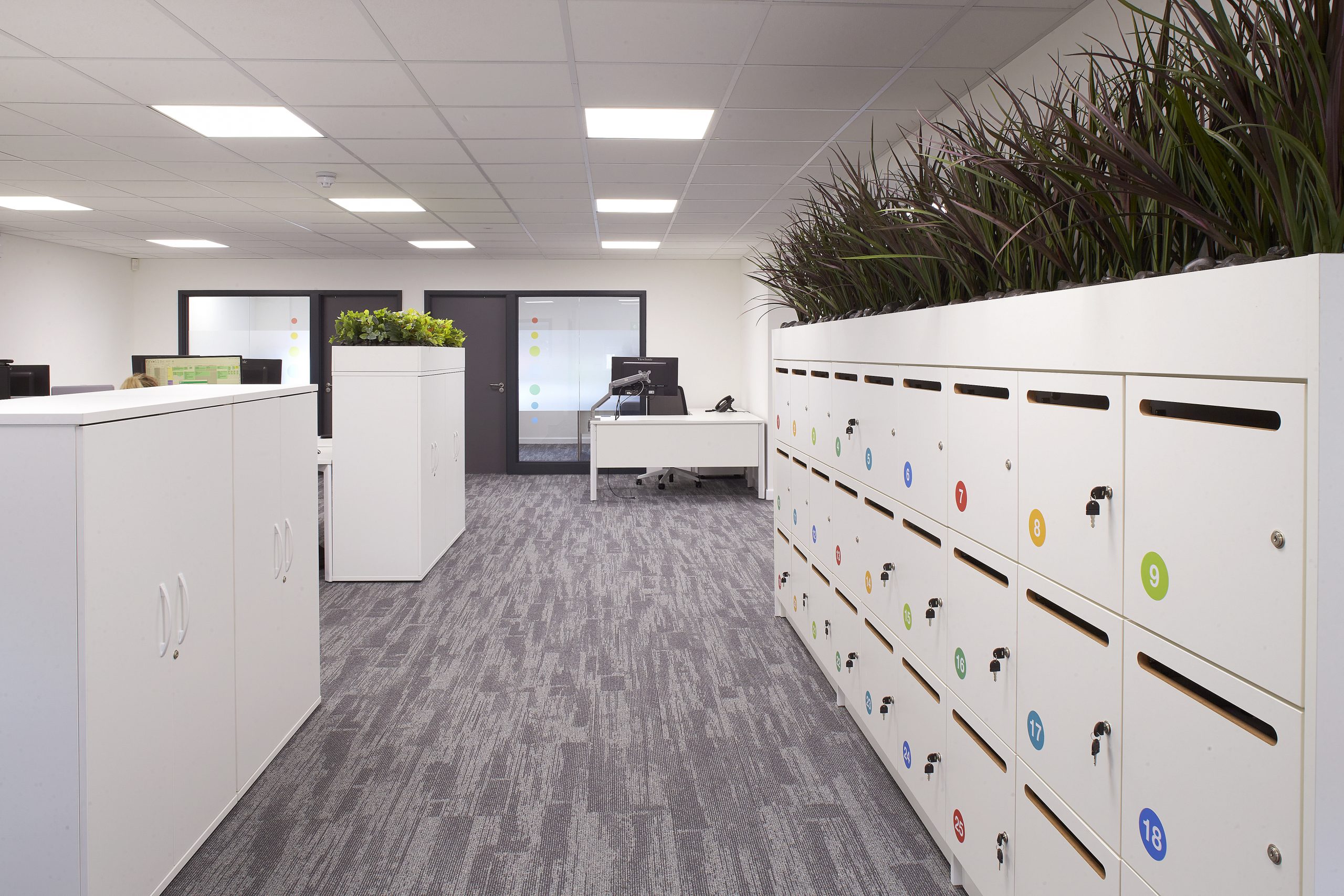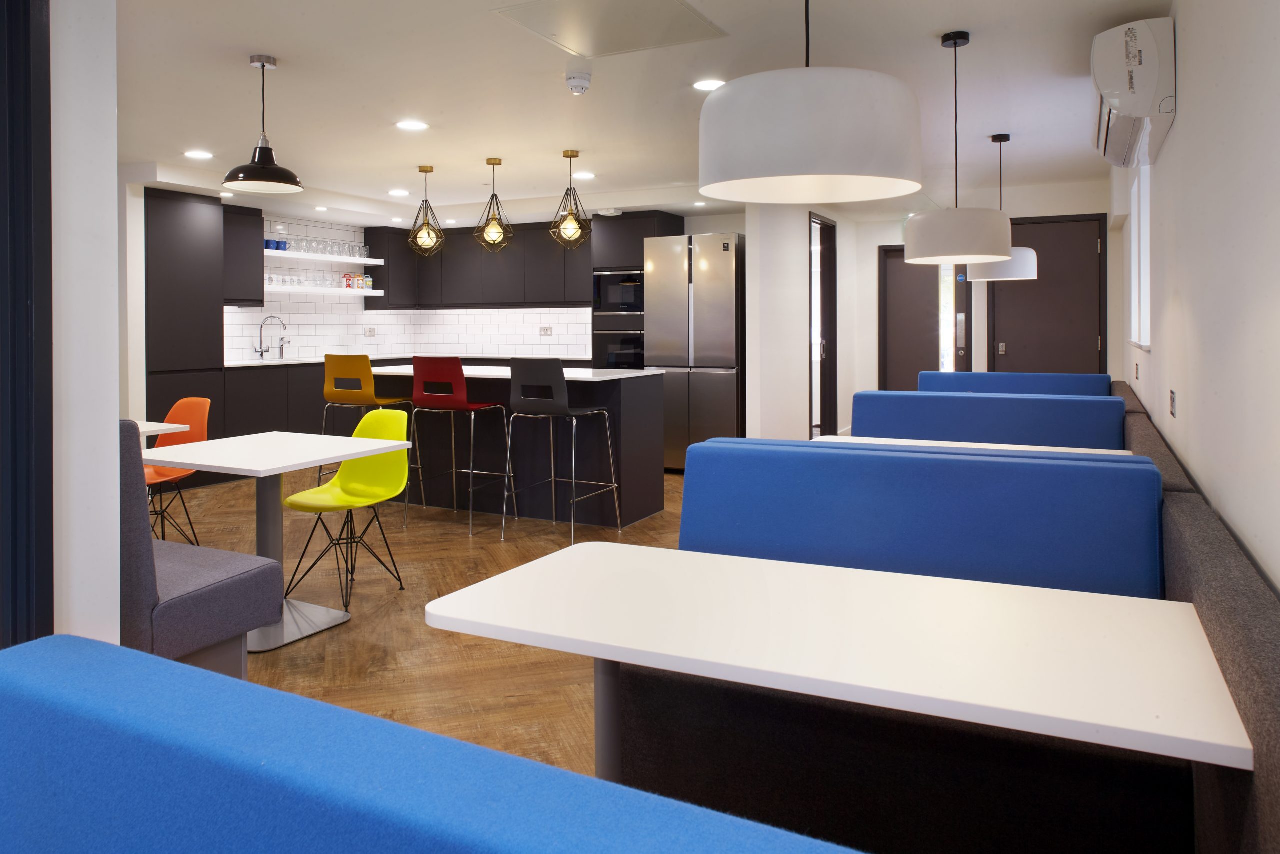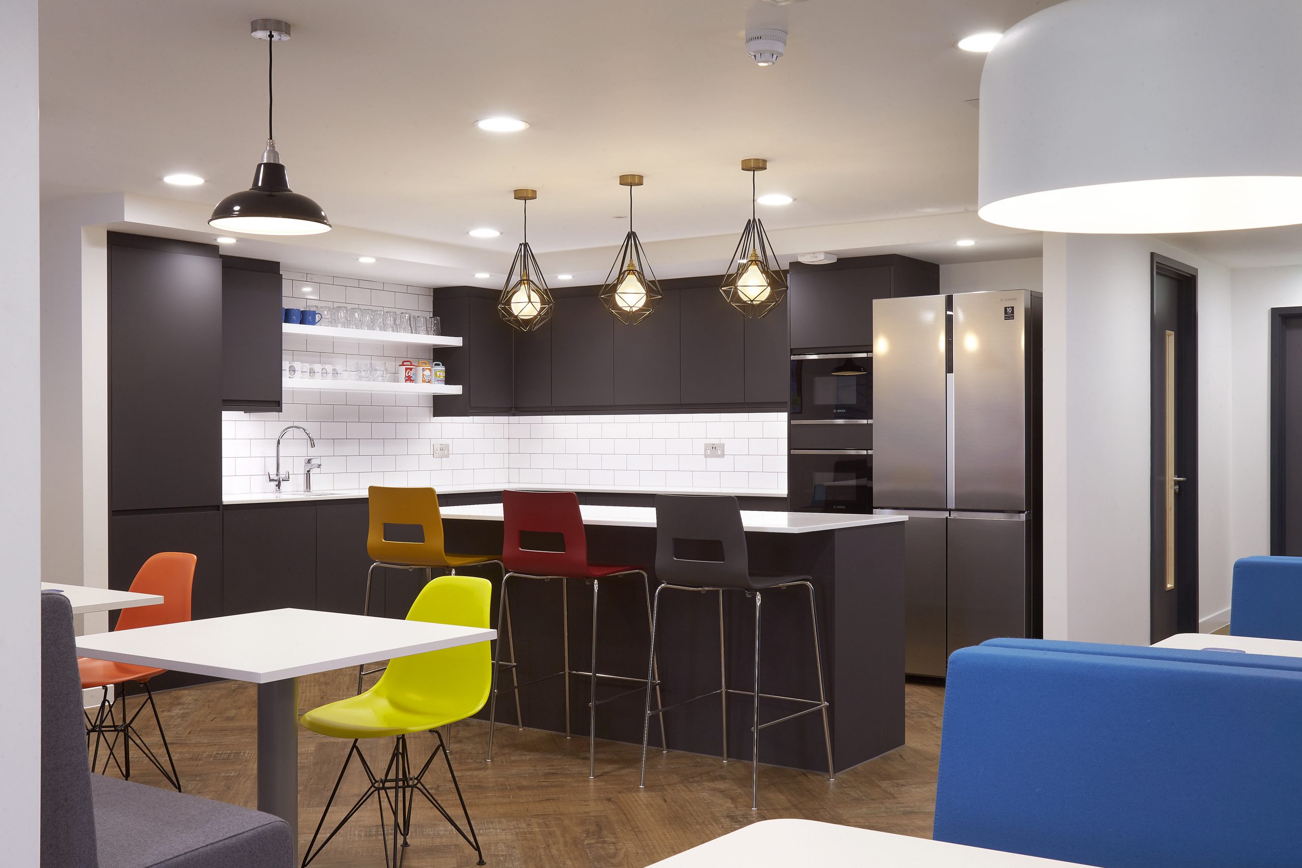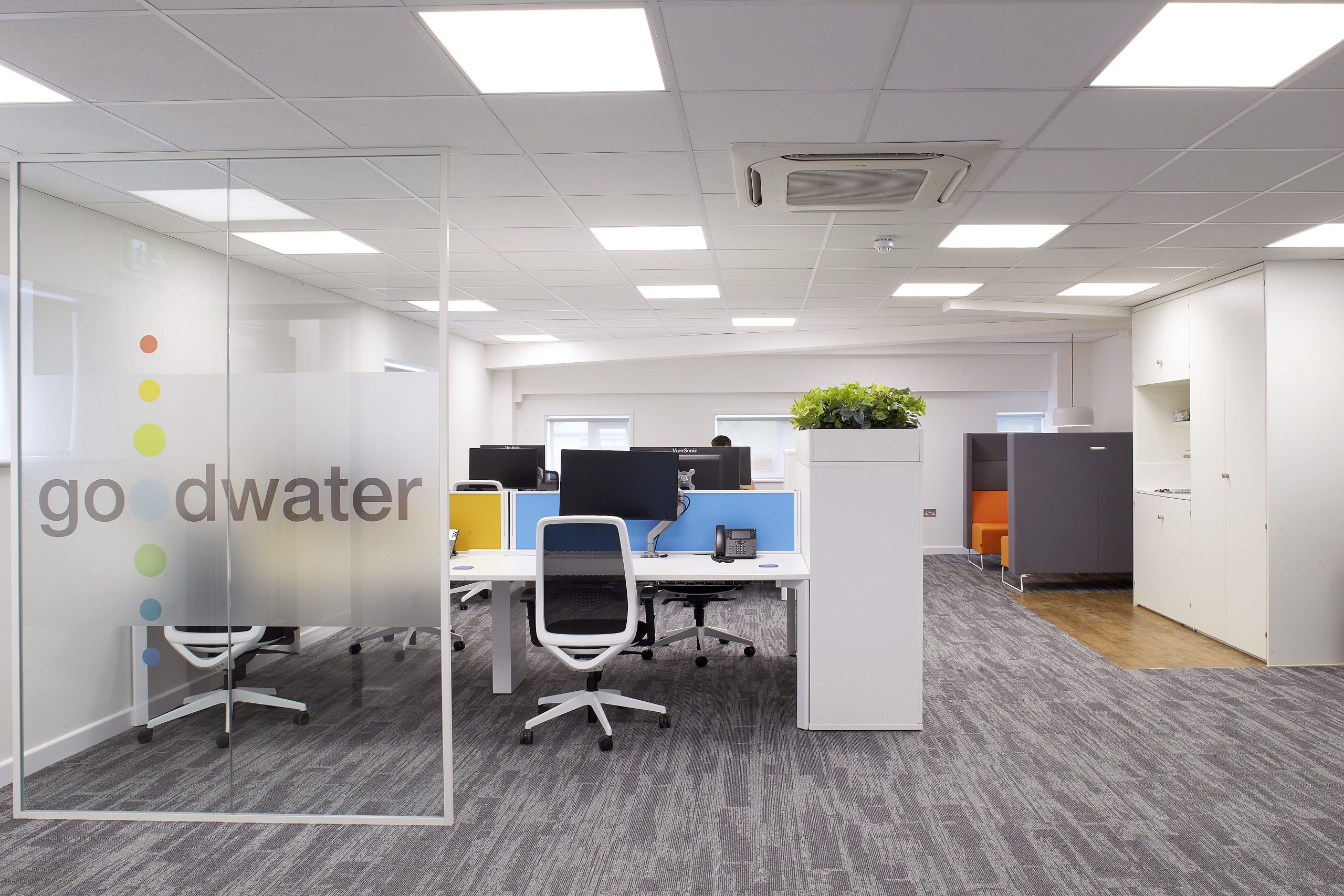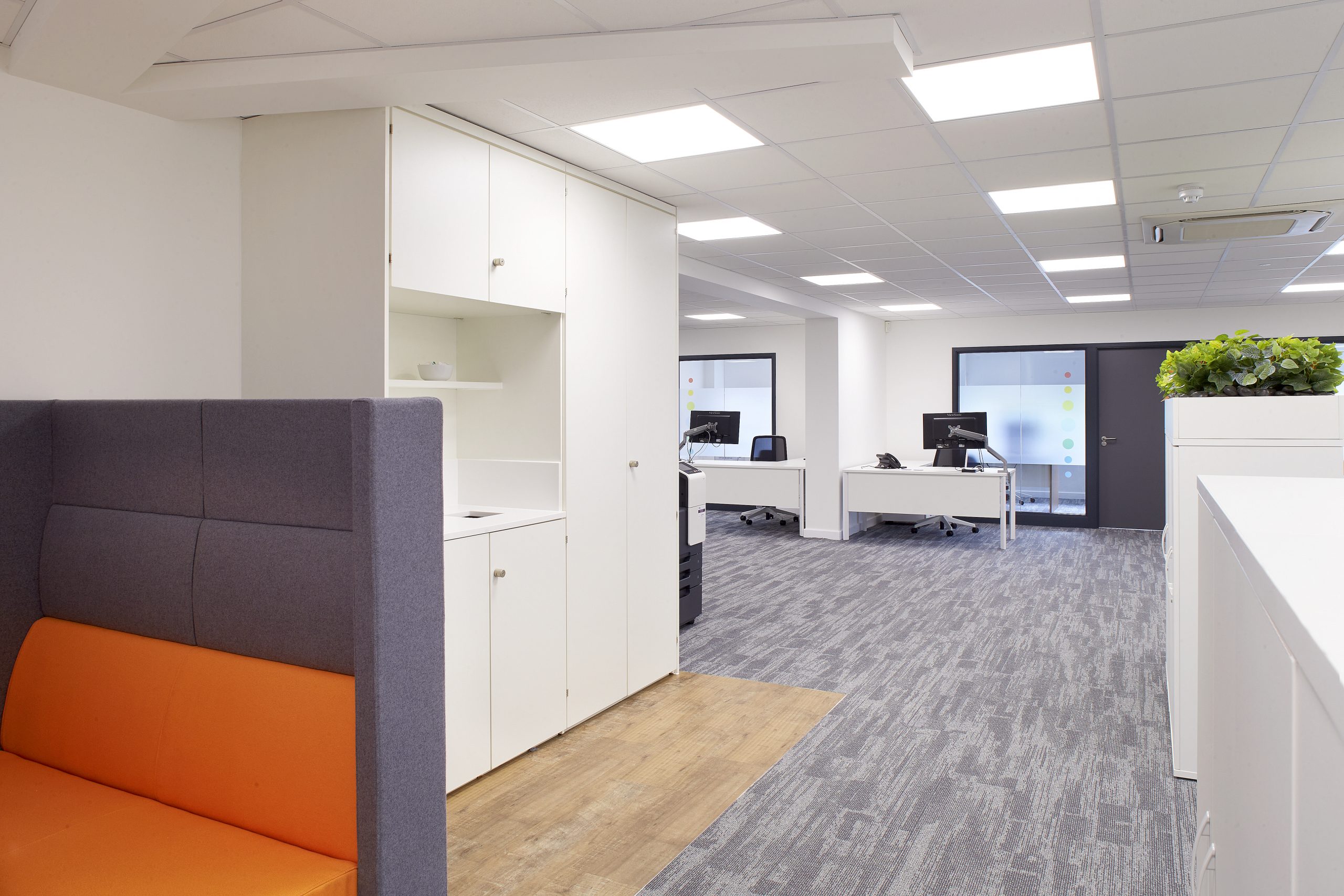 Solid and glazed partitions with feature plasterboard ceilings create a modern open-plan space, perfect for the agile working environment required. Complete with the plenty of greenery which not only divides areas in a friendly fashion but is a staple in modern offices. New tea points with solid surface worktops and specialist joinery sit at the heart of the office allowing staff to feel relaxed and comfortable. Booth seating as well as tables and chairs were installed with splashes of colour, encouraging employees to gravitate to the space for lunch, meetings and socialising. The refurbishment was loved by the client for bringing a fresh and modern feel to a once tired working space.