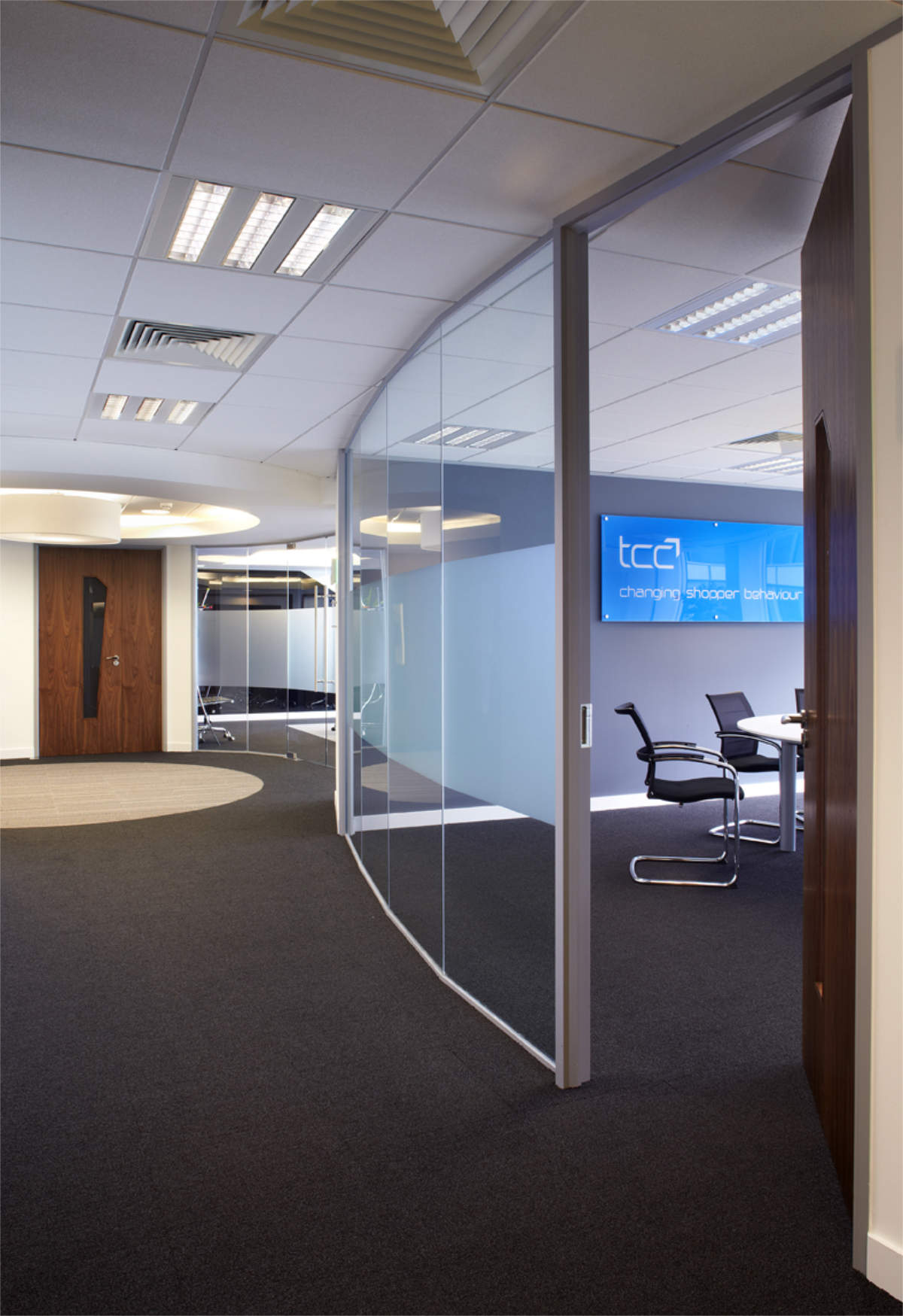 One of the most ambitious projects Bushcrafted have completed. TCC had a fluent design in mind when they teamed up with Morgan Lovell. We created sweeping curved partitions flowing into brilliant ceiling features. We also installed a piece of curved glass in an amazing joinery unit. There were numerous design details, as you can see from the images and has been built exactly as it was designed. This was built within a five week programme.